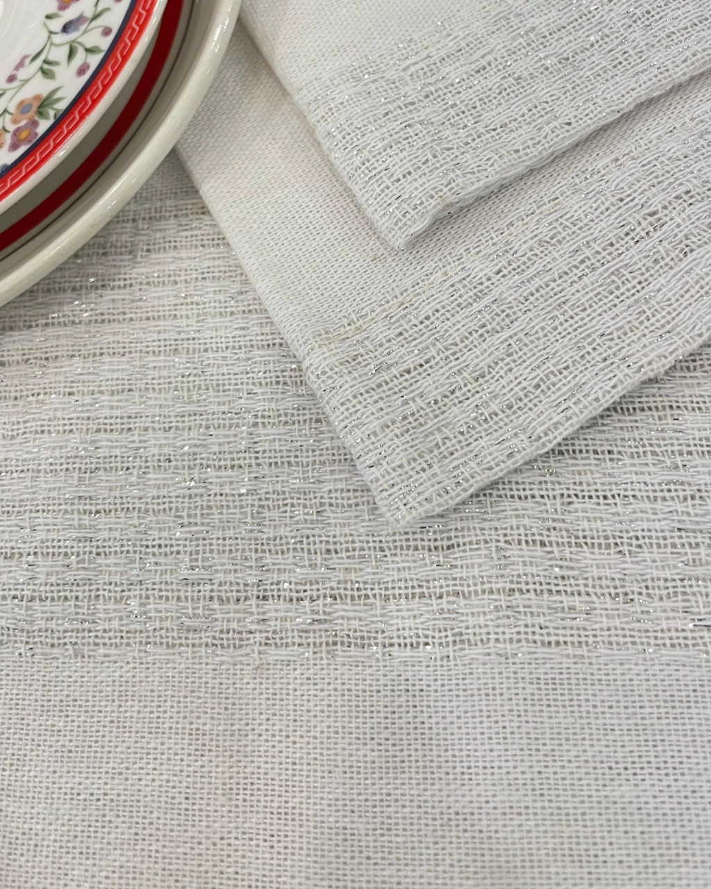 Crea un ambiente festivo y elegante con nuestro conjunto de mantel y sevilletas de lujo realizados en puro algodón y finos detalles de brillo. Disfruta de reuniones con familia , con amigos o eventos especiales acompañados de estilo y distinción.