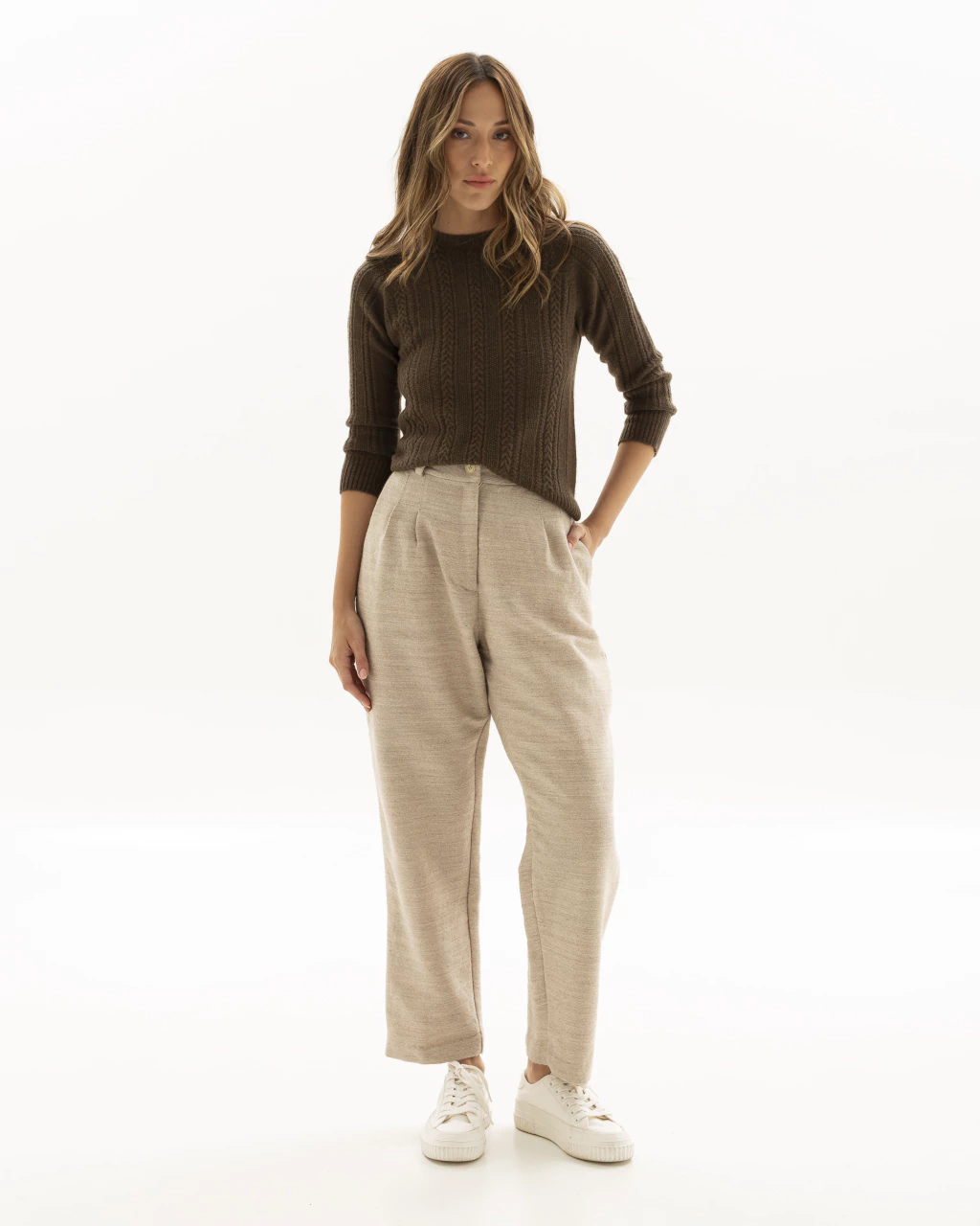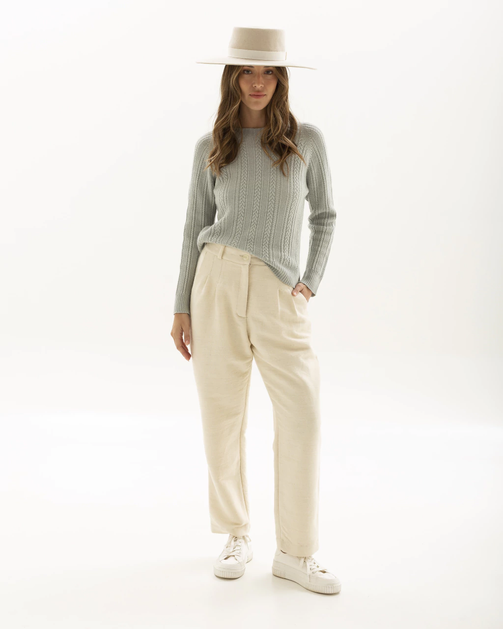 Sweater escote redondo al cuerpo. El tejido cuenta con detalles de trenzas y puntos de relieve.